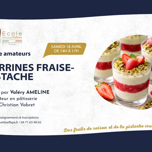 Programme détaillé & inscriptions : https://ecolechristianvabret.catalogueformpro.com/11/stages-amateurs/2851235/003-verrines-fraise-pistache?fbclid=IwY2xjawQ4r-JleHRuA2FlbQIxMABicmlkETFMeUYyR2xvR3RneW9MdUpoc3J0YwZhcHBfaWQQMjIyMDM5MTc4ODIwMDg5MgABHs0g7WTSRw_5Oy4UcvNkjMZj0U5NUJVR0rLTsxg1mezo6irkYxr1kjzkYEud_aem_UlB-xgHh8AHfMZJyegyJng