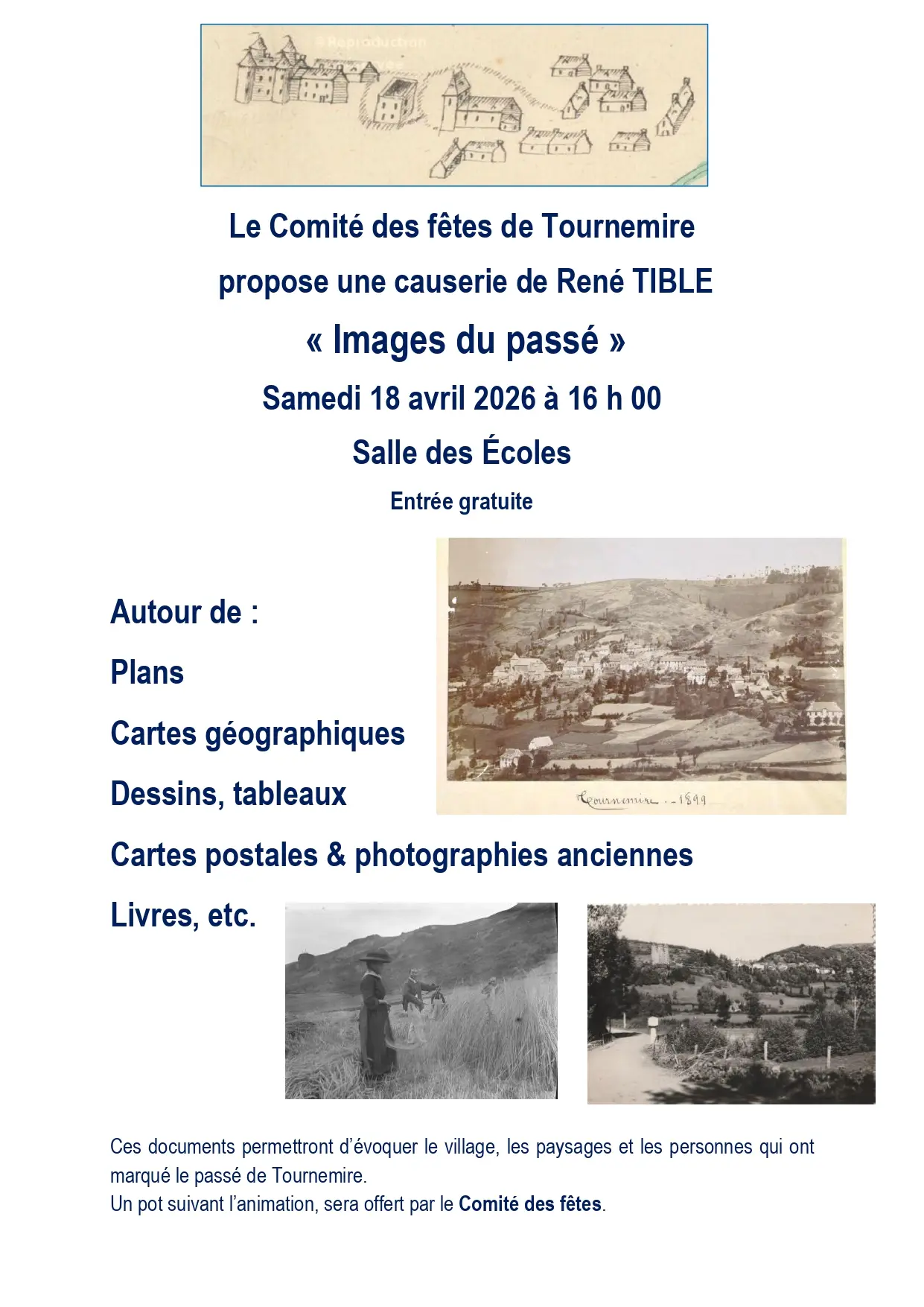 À vos agendas, le comité des fêtes de Tournemire organise une causerie autour de plans, cartes géographiques, dessins, tableaux, cartes postales et photographies anciennes, livres, etc...