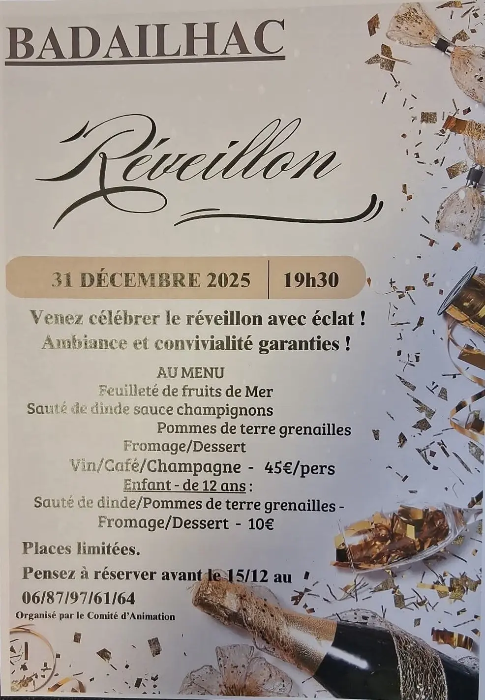 A l'occasion du nouvel an, le comité d'animation de Badailhac vous propose une soirée animée, pour accueillir 2026 avec style et éclat. Repas et soirée dansante.